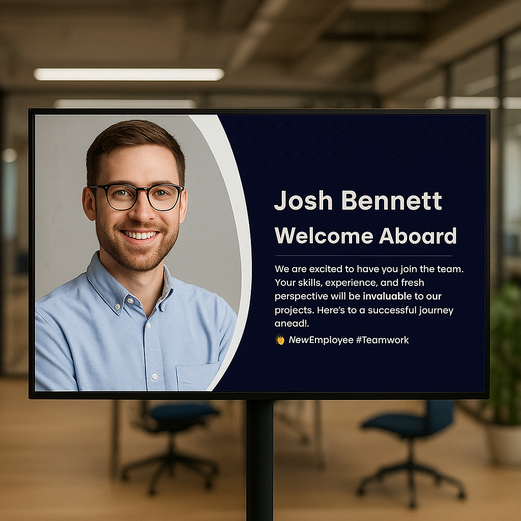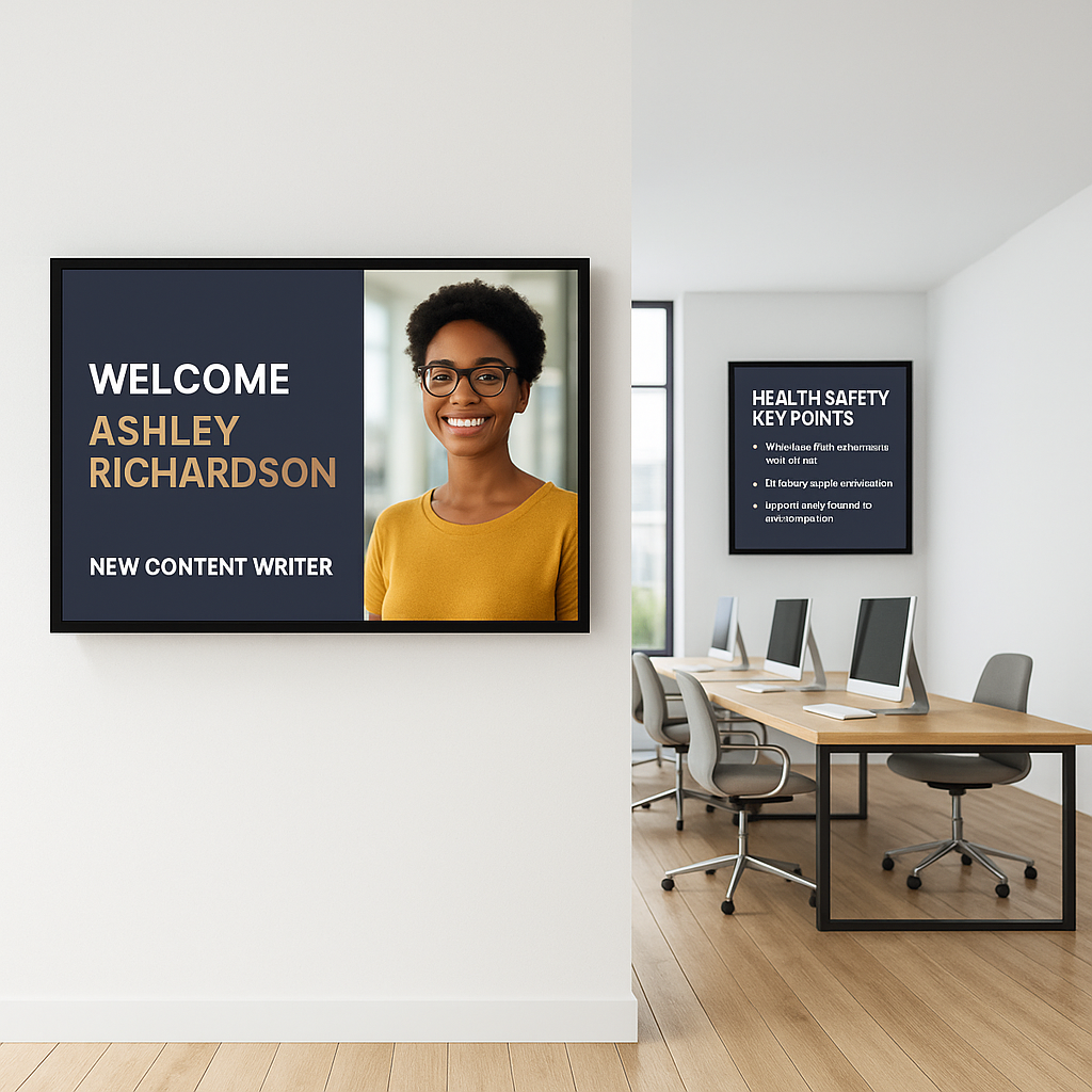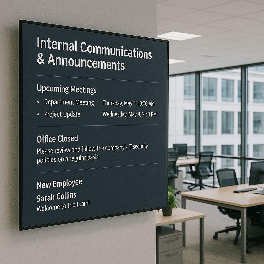 Transform your workplace screens into powerful communication tools that keep teams informed, aligned, and motivated. From performance dashboards and shift schedules to company updates and training content, employee-facing screens deliver critical information in real time, boosting productivity, reducing miscommunication, and fostering a more connected workforce.