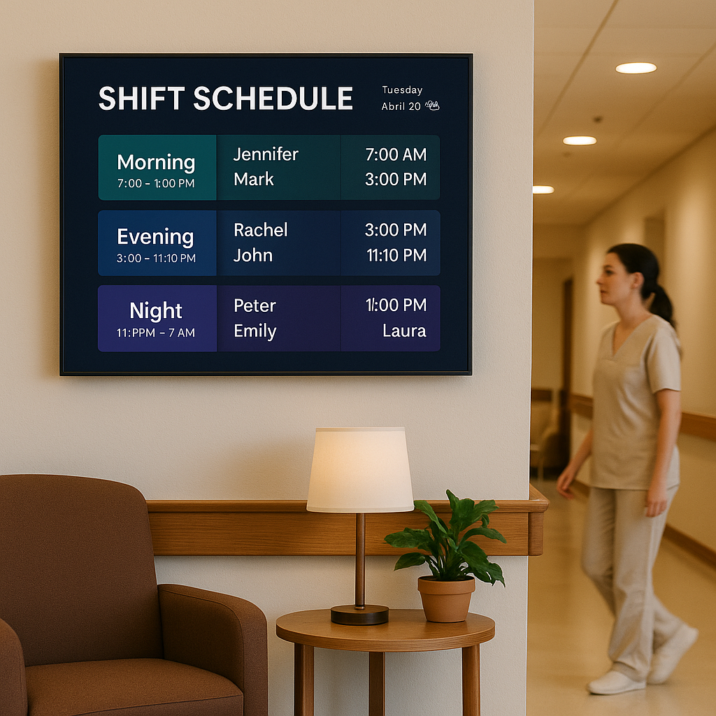 Display real-time shift assignments, break times, and task rotations to keep staff organized without manual printouts.